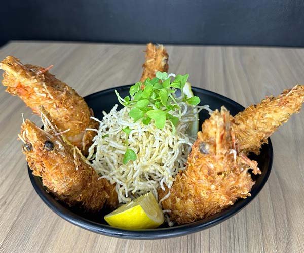 Camarones o langostinos apanados con coco rallado y panko, fritos hasta quedar crujientes. Sazonados con especias tailandesas como cilantro, lima y ajo, servidos con salsa dulce.