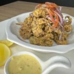 Papas cocidas y cortadas en cuadros, cubiertas con una cremosa salsa huancaína y decoradas con brotes frescos de cilantro.