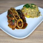 Salmón, calamar y camarón en salsa teriyaki, acompañados de yakisoba. Un plato sofisticado que fusiona los sabores del mar con la intensidad de la cocina teppanyaki.